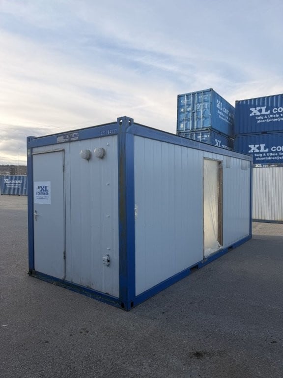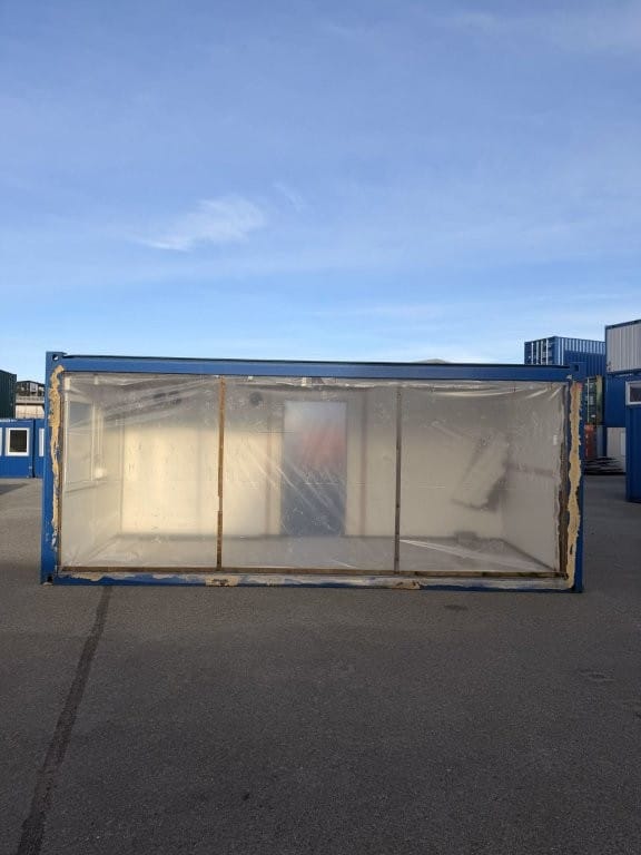 Vi selger en 20 fots salmodul, venstre side, produsert i 2017. Modulen har vært brukt som del av en større sal-løsning og har derfor åpen høyre langside.